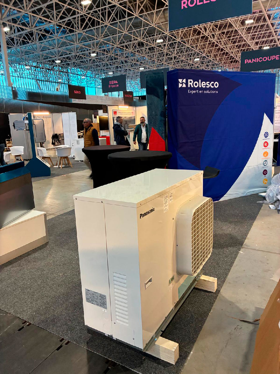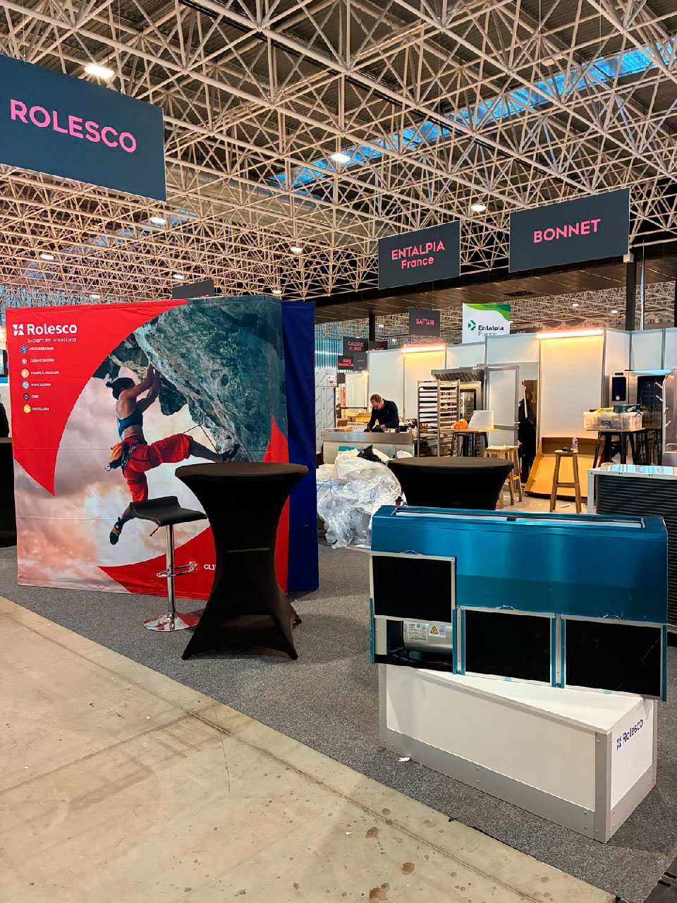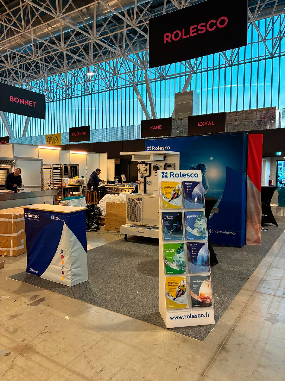 stand éphémère pour salon : fabrication d’un comptoir en tube assemblée, avec visuel imprimé sur tissus polyester, attache par velcro.